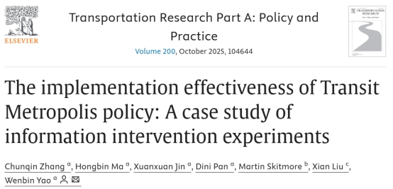 2025年10月,张春勤团队在国际知名期刊《Transportation Research Part A: Policy and Practice》上发表题为“The implementation effectiveness of Transit Metropolis policy: a case study of information intervention experiments”的文章。该成果第一作者为张春勤副教授,姚文彬讲师为论文通讯作者,体育博彩平台-十大线上体育投注博彩平台